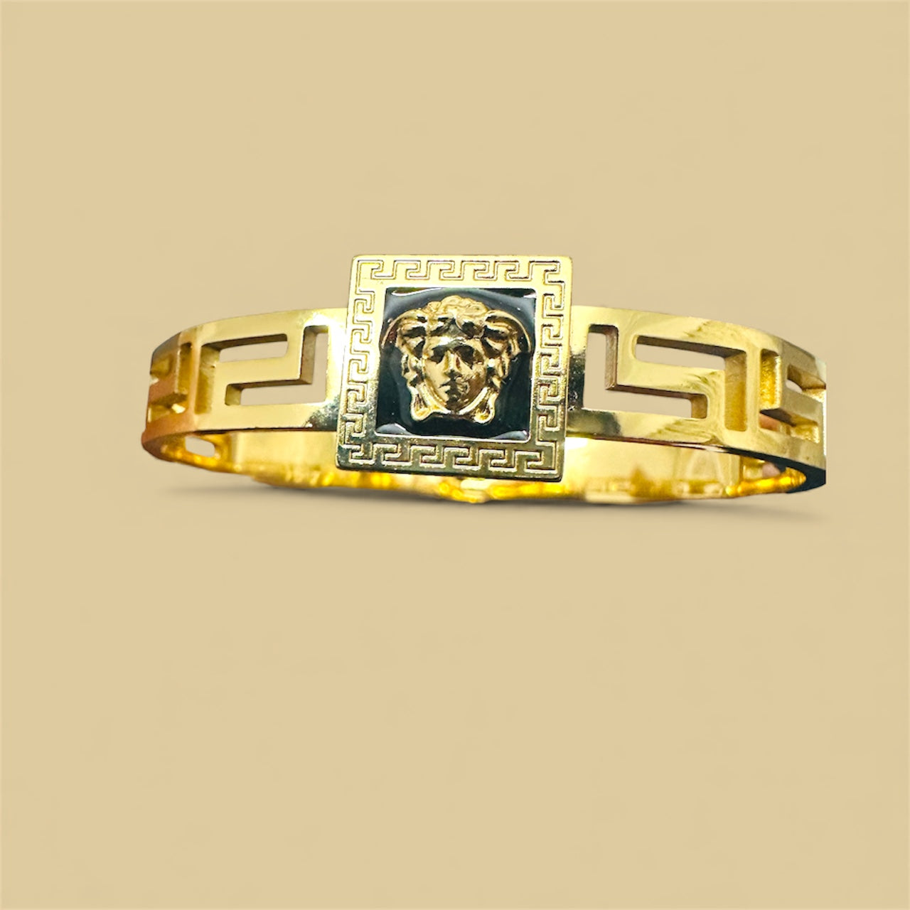 Add a touch of timeless elegance to your look with this beautifully crafted anti-tarnish stainless steel bracelet from Raimi Jewels. Designed with a bold square centerpiece and detailed Greek-key pattern, this bracelet exudes sophistication and high-class charm.