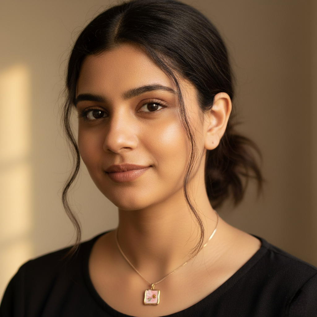 At Raimi Jewels, we believe true luxury lies in both beauty and enduring quality. This statement necklace features a captivating, square-shaped pendant, meticulously crafted with an inner tableau of soft, romantic hues. Inside, a gracefully rendered floral arrangement—blushing pink blossoms and delicate green leaves, with hints of a miniature golden rosebud—are suspended in a crystal-clear, resin-like setting. Each detail is a testament to artistic precision, creating a miniature garden that rests close to your heart.