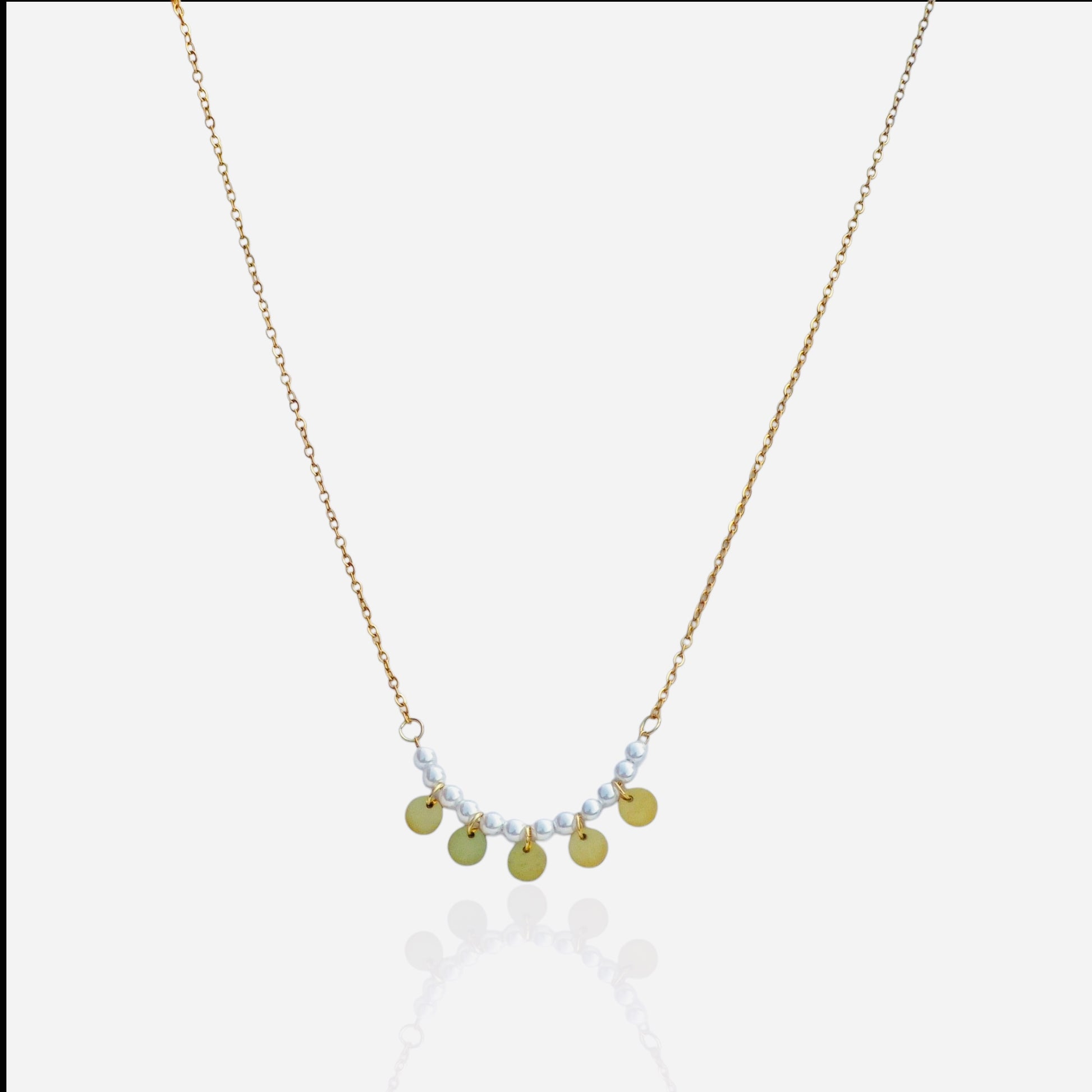 The necklace features a graceful arch of lustrous miniature pearls, perfectly interspersed with small, polished gold-toned coin charms that shimmer and dance with your movement. This beautiful drop design is centered on a delicate yet strong chain, all crafted from the highest quality stainless steel.