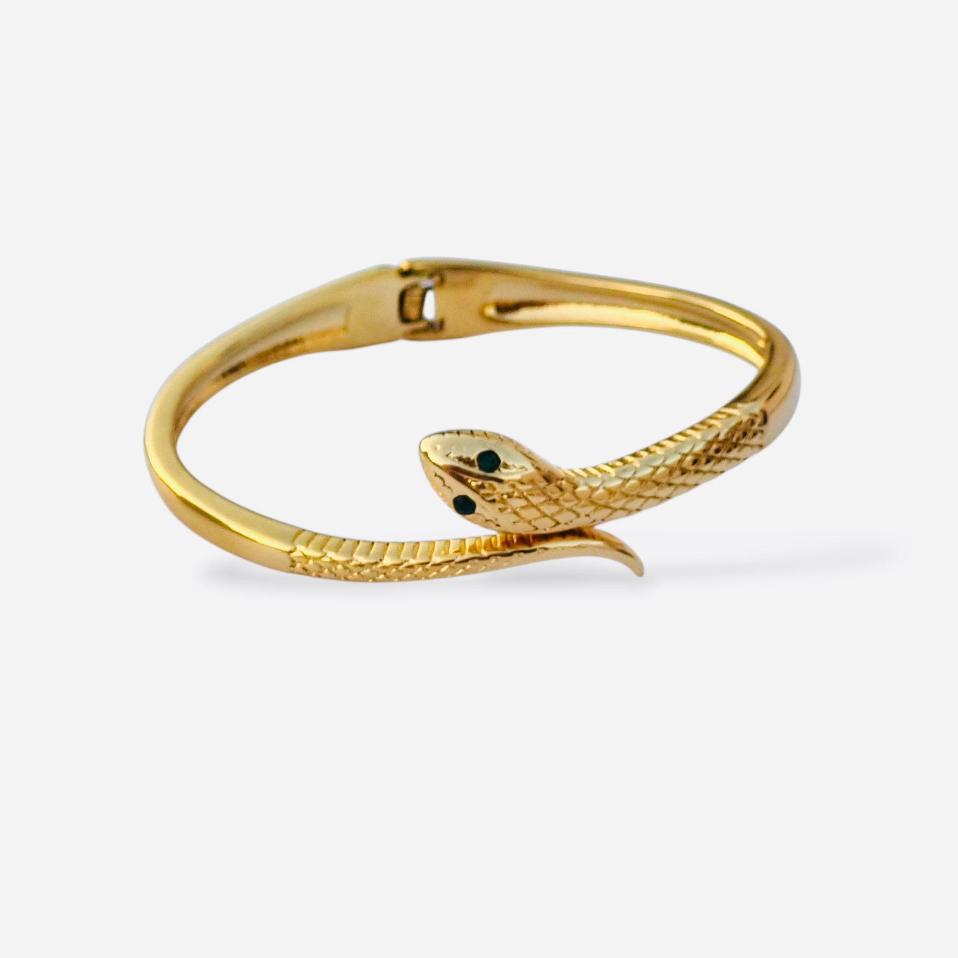 Sculpted into a graceful, coiling snake, this bangle features exquisite textured detailing that captures the realistic scales and mesmerizing movement of a serpent. The head is finished with striking dark eyes, giving the piece a watchful, alluring presence. The entire bangle is rendered in a luxurious, high-shine gold tone, crafted from highest quality stainless steel.