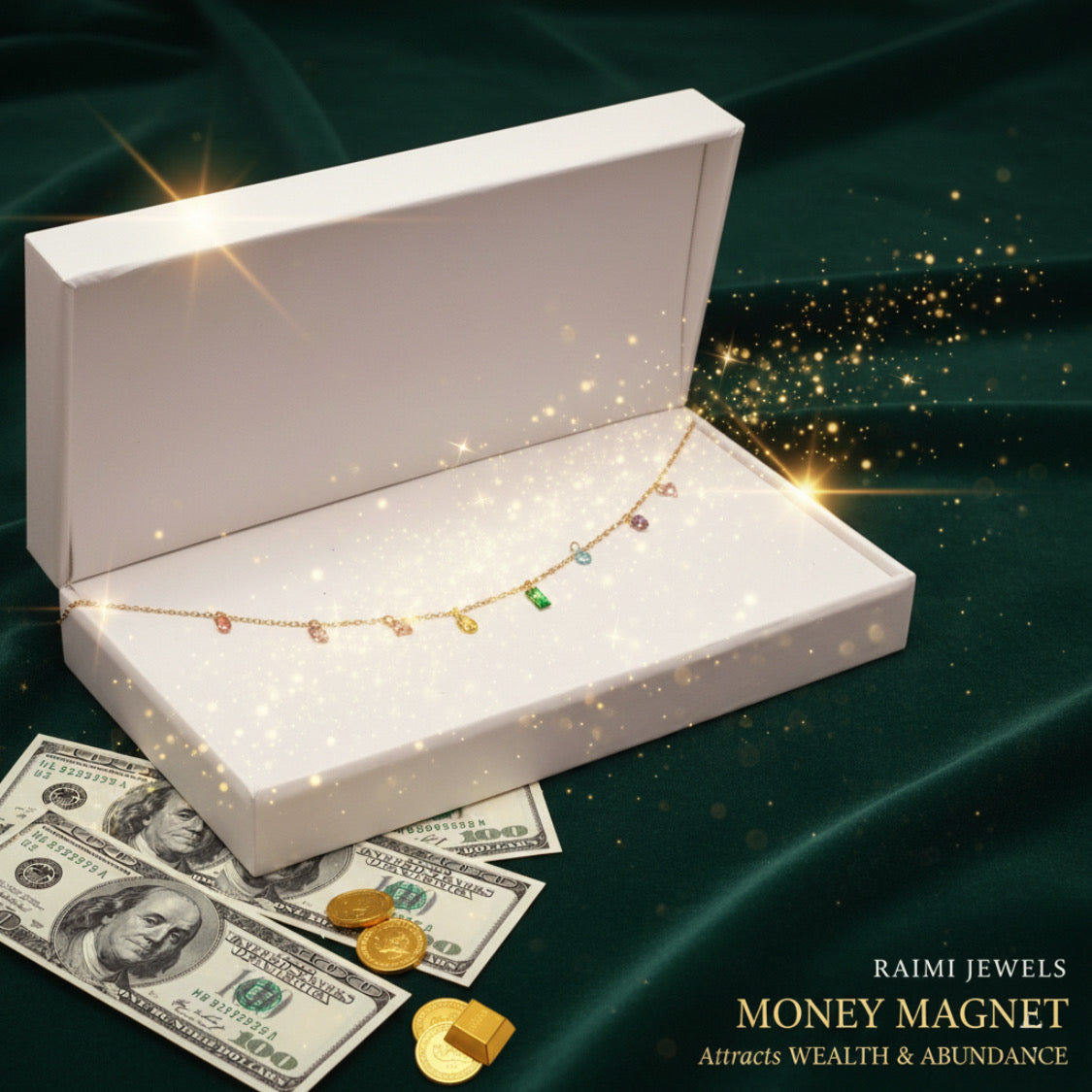 Step into your power and manifest your desires with the Spectrum of Abundance Necklace from Raimi Jewels. This delicate yet potent piece is more than jewelry—it's your personal Money Magnet, designed to attract wealth, luck, and limitless opportunity into your life.