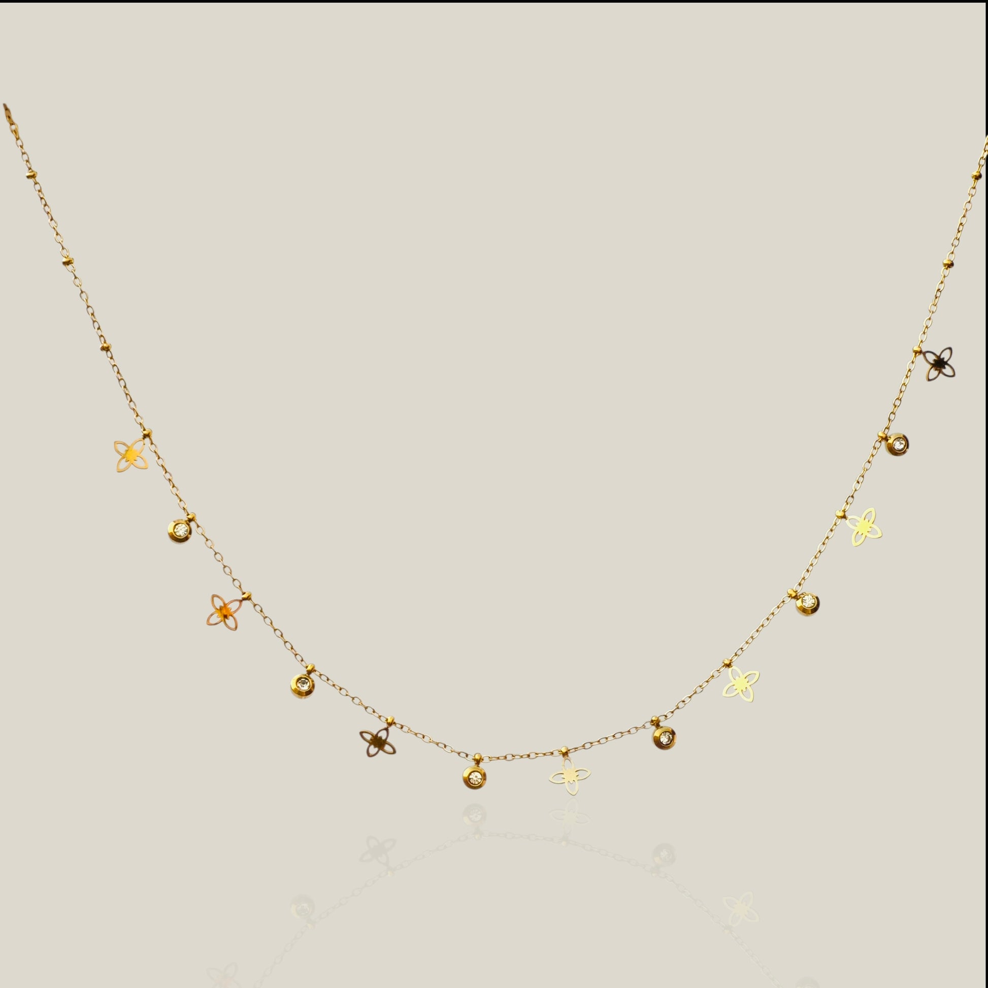 The slender chain is adorned with a playful scattering of small, charming charms. These feature alternating motifs, including tiny sparkling crystals (or small beads/stones) and intricately detailed four-petal flowers (or butterfly/star shapes, depending on the closest look) that dangle gracefully along the collarbone.